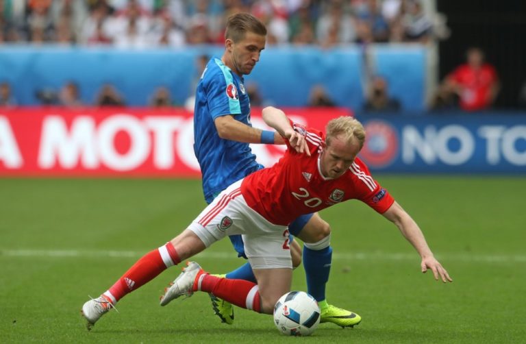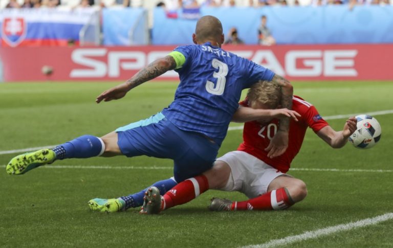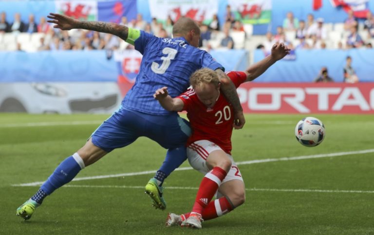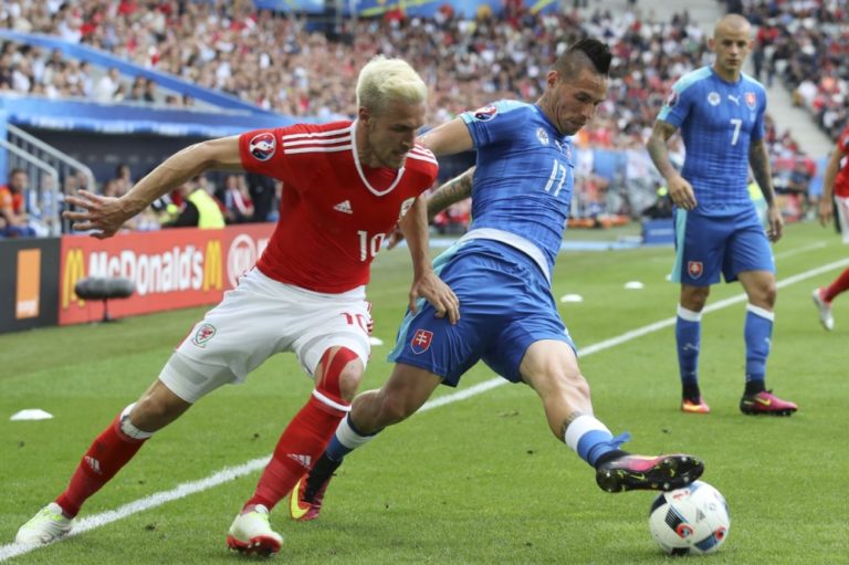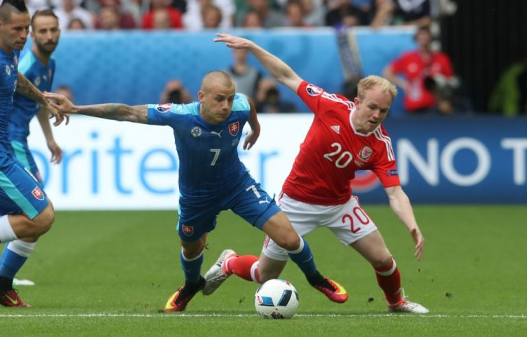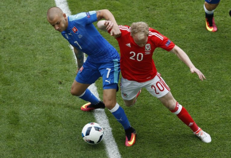 Slovenský futbalista Vladimír Weiss v súboji s Walešanom Chrisom Gunterom počas zápasu na majstrovstvách Európy. Bordeaux, 11. jún 2016. Foto: SITA/AP