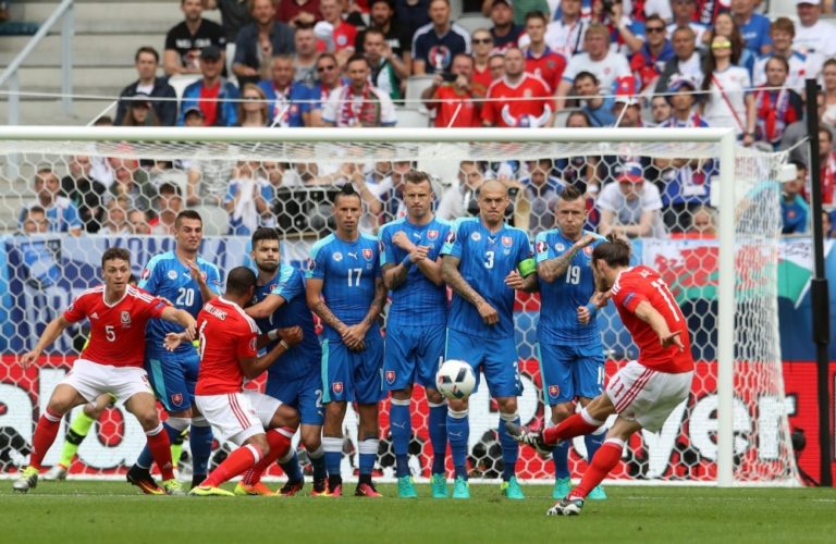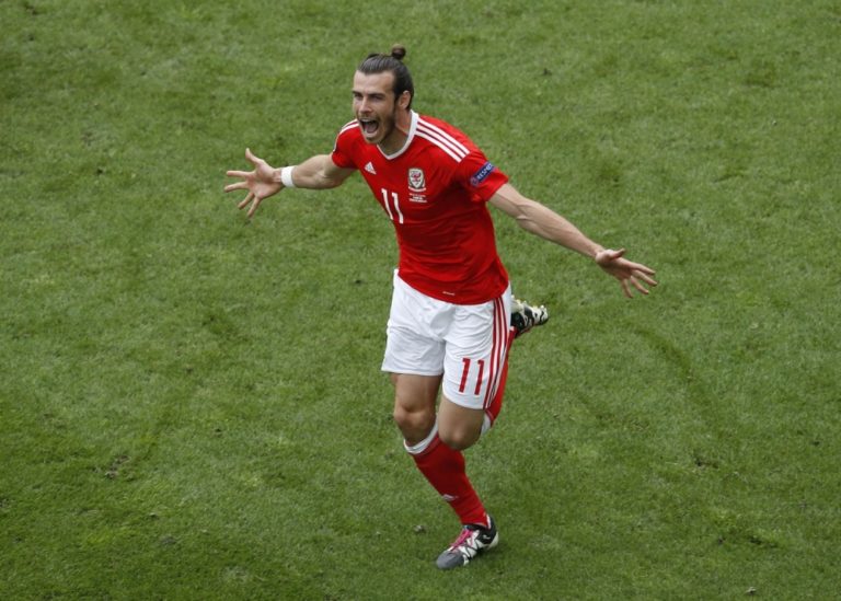 Waleský futbalista Gareth Bale sa raduje z gólu v sieti Slovenska počas zápasu na majstrovstvách Európy. Bordeaux, 11. jún 2016. Foto: SITA/AP