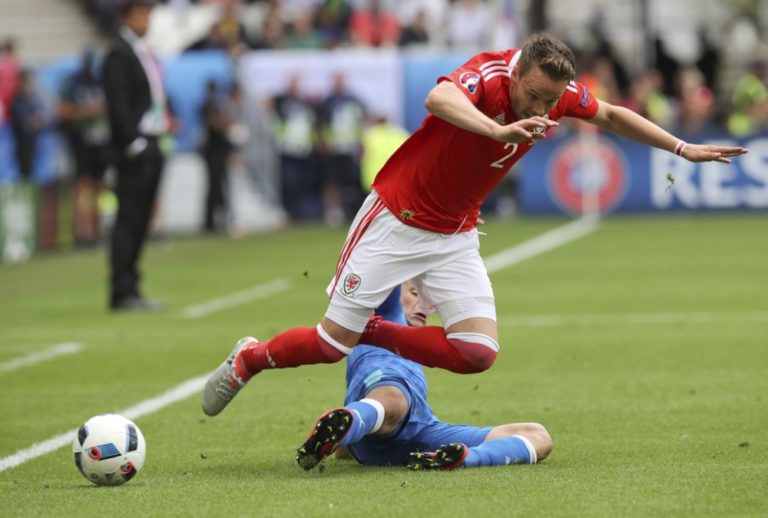 Waleský futbalista Jonathan Williams v súboji so Slovákom Vladimírom Weissom počas zápasu na majstrovstvách Európy. Bordeaux, 11. jún 2016. Foto: SITA/AP