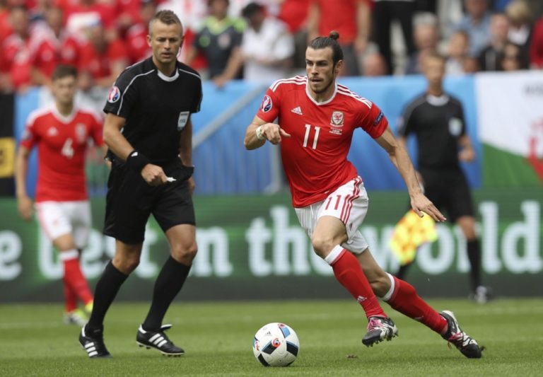 Nórsky rozhodca Svein Oddvar Moen sleduje hviezdu Walesu Garetha Balea počas zápasu majstrovstiev Európy proti Slovensku na Stade de Bordeaux. Bordeaux, 11. jún 2016. Foto: SITA/AP