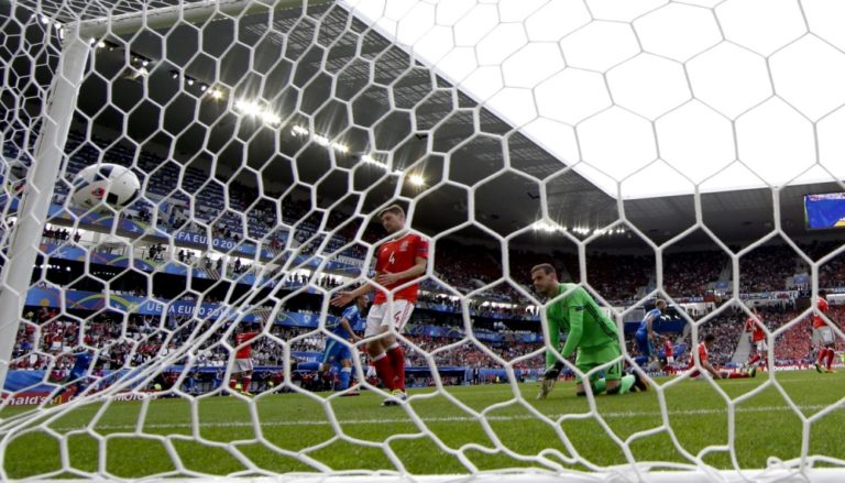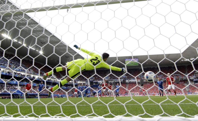 Waleský futbalista Gareth Bale prekonáva slovenského brankára Matúša Kozáčika počas zápasu na majstrovstvách Európy. Bordeaux, 11. jún 2016. Foto: SITA/AP