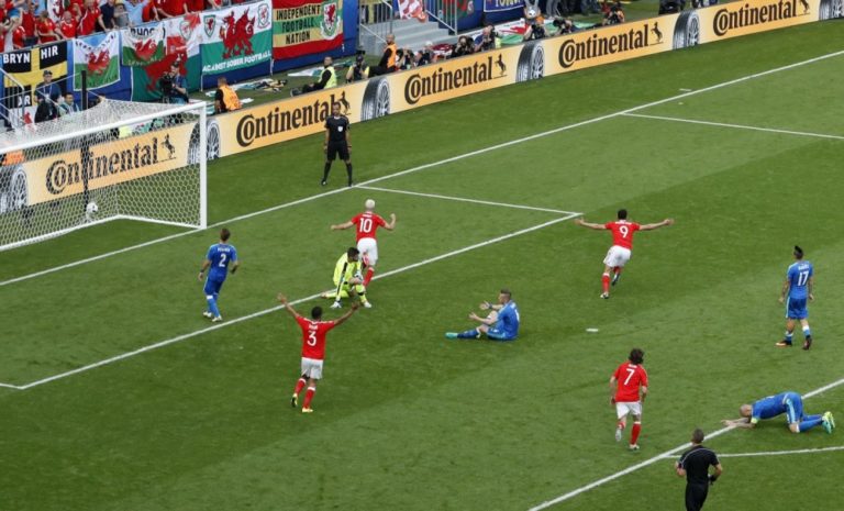 Radosť hráčov Walesu po góle v sieti Slovenska počas zápasu na majstrovstvách Európy. Bordeaux, 11. jún 2016. Foto: SITA/AP