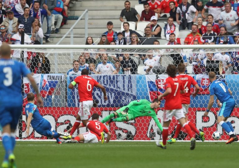 Slovenský futbalista Ondrej Duda prekonáva brankára Walesu Dannyho Warda počas zápasu na majstrovstvách Európy. Bordeaux, 11. jún 2016. Foto: SITA/AP
