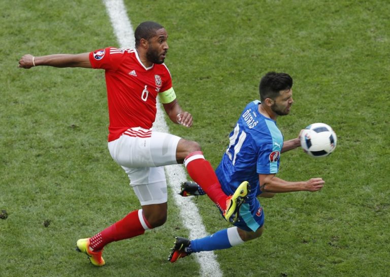 Waleský futbalista Ashley Williams v súboji so Slovákom Michalom Ďurišom počas zápasu na majstrovstvách Európy. Bordeaux, 11. jún 2016. Foto: SITA/AP