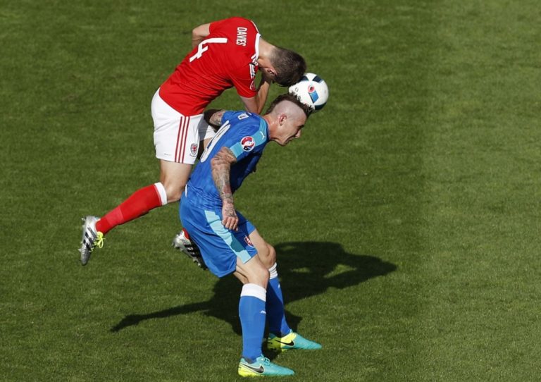 Waleský futbalista Ben Davies v súboji so Slovákom Jurajom Kuckom počas zápasu na majstrovstvách Európy. Bordeaux, 11. jún 2016. Foto: SITA/AP