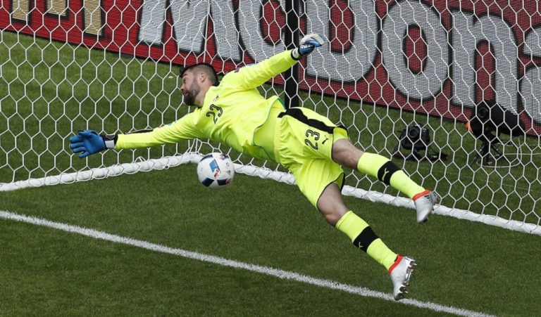 Zákrok slovenského brankára Matúša Kozáčika po zakončení waleskej hviezdy Garetha Balea počas zápasu na majstrovstvách Európy. Bordeaux, 11. jún 2016. Foto: SITA/AP