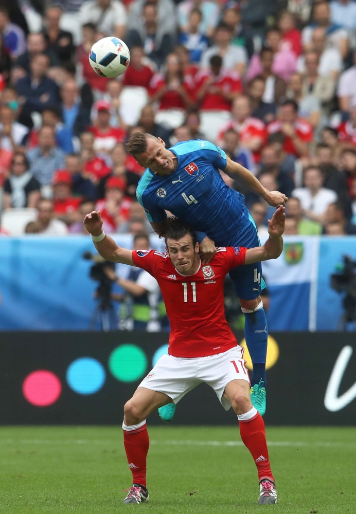 Waleská hviezda Gareth Bale v súboji so Slovákom Dušanom Šventom počas zápasu na majstrovstvách Európy vo futbale. Bordeaux, 11. jún 2016. Foto: SITA/AP