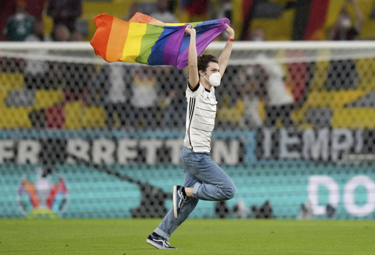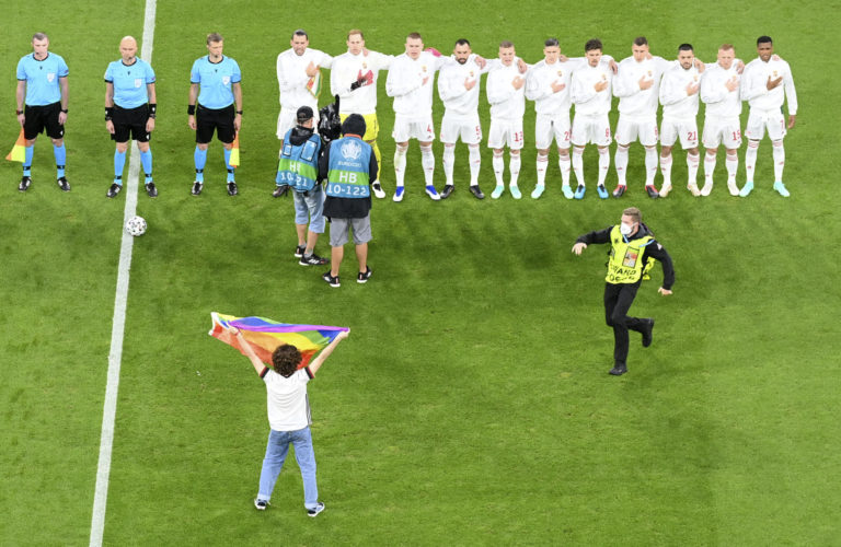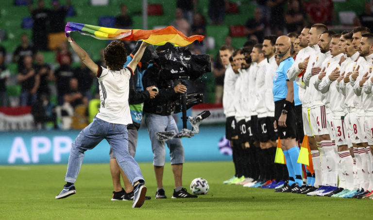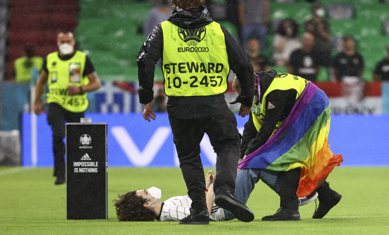 Počas hymny pred zápasom F-skupiny na ME vo futbale 2020 medzi Nemeckom a Maďarskom vbehol na trávnik muž s dúhovou vlakou. Mníchov (Allianz Arena), 23. jún 2021. Foto: Kai Pfaffenbach/Pool via AP.