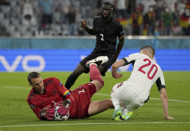 Zákrok nemeckého gólmana Manuela Neuera počas zápasu F-skupiny na ME vo futbale 2020 proti Maďarsku. Mníchov (Allianz Arena), 23. jún 2021. Foto: SITA/AP.