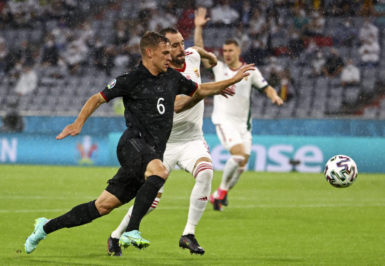 Maďarský reprezentant Attila Fiola v súboji s Nemcom Joshuom Kimmichom počas zápasu F-skupiny na ME vo futbale 2020. Mníchov (Allianz Arena), 23. jún 2021. Foto: Kai Pfaffenbach/Pool via AP.
