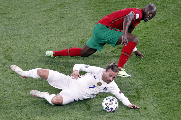 Francúzsky reprezentant Antoine Griezmann v súboji s Portugalčanom Danilom Pereirom počas zápasu F-skupiny na ME vo futbale 2020. Budapešť (Puskás Arena), 23. jún 2021. Foto: SITA/AP.