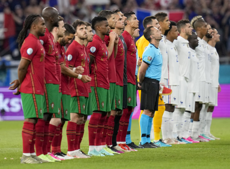 Reprezentanti Portugalska a Francúzska pred ich vzájomným zápasom v F-skupine na ME vo futbale 2020. Budapešť (Puskás Arena), 23. jún 2021. Foto: SITA/AP.