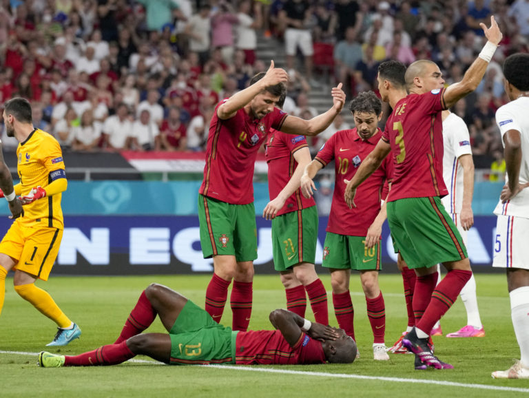 Otrasený portugalský reprezentant Danilo Pereira po zrážke s francúzskym gólmanom Hugom Llorisom počas zápasu F-skupiny na ME vo futbale 2020. Budapešť (Puskás Arena), 23. jún 2021. Foto: SITA/AP.