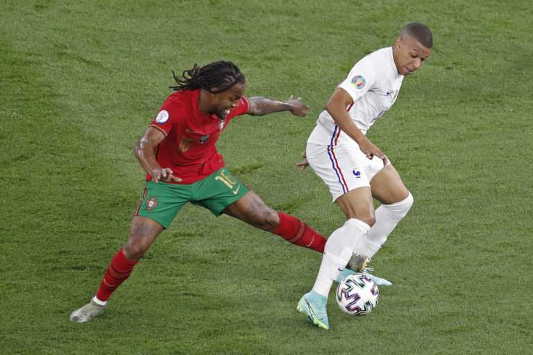 Portugalský reprezentant Renato Sanches sa snaží zobrať loptu Francúzovi Kylianovi Mbappému počas zápasu F-skupiny na ME vo futbale 2020. Budapešť (Puskás Arena), 23. jún 2021. Foto: SITA/AP.