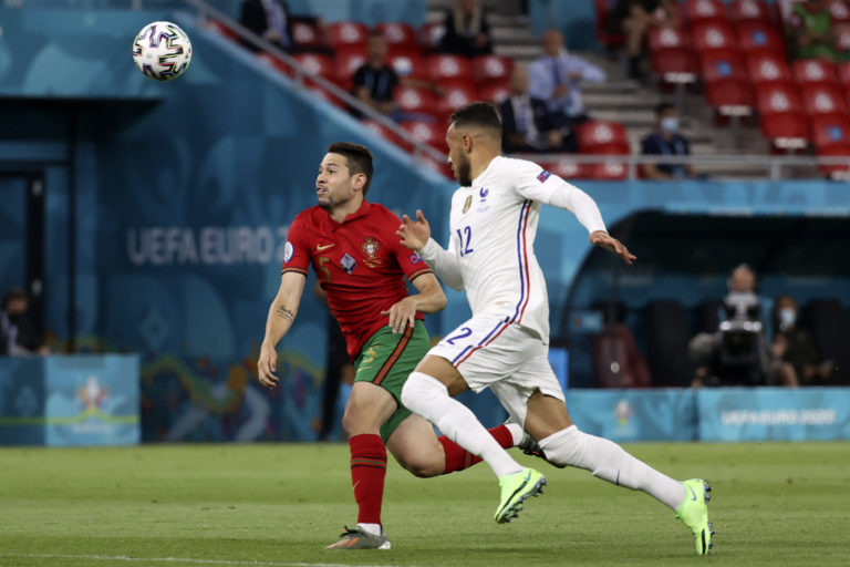 Portugalský reprezentant Raphael Guerreiro a Francúz Corentin Tolisso počas zápasu F-skupiny na ME vo futbale 2020. Budapešť (Puskás Arena), 23. jún 2021. Foto: Bernadett Szabo, Pool photo via AP.