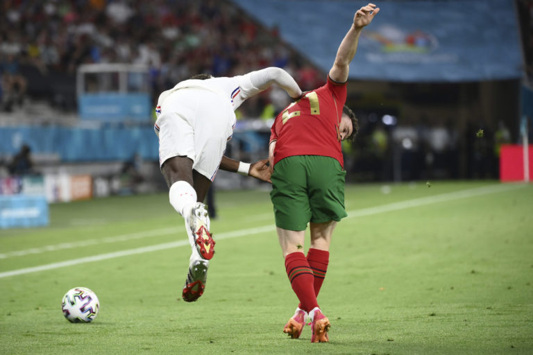 Zľava: Francúzsky reprezentant Paul Pogba v súboji o loptu s Portugalčanom Diogom Jotom počas zápasu F-skupiny na ME vo futbale 2020. Budapešť (Puskás Arena), 23. jún 2021. Foto: Franck Fife, Pool photo via AP.