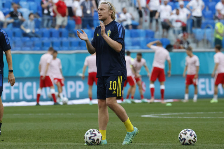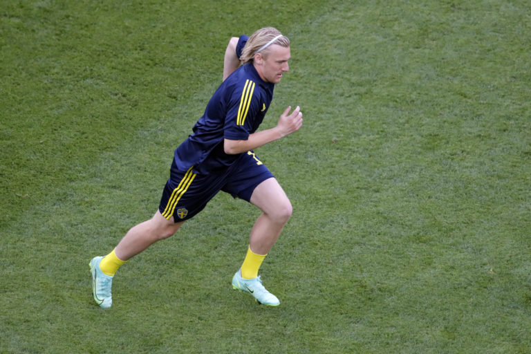 Švédsky reprezentant Emil Forsberg počas rozcvičky pred zápasom E-skupiny na ME vo futbale 2020 proti Poľsku. Petrohrad (Gazprom Arena), 23. jún 2021. Foto: SITA/AP.