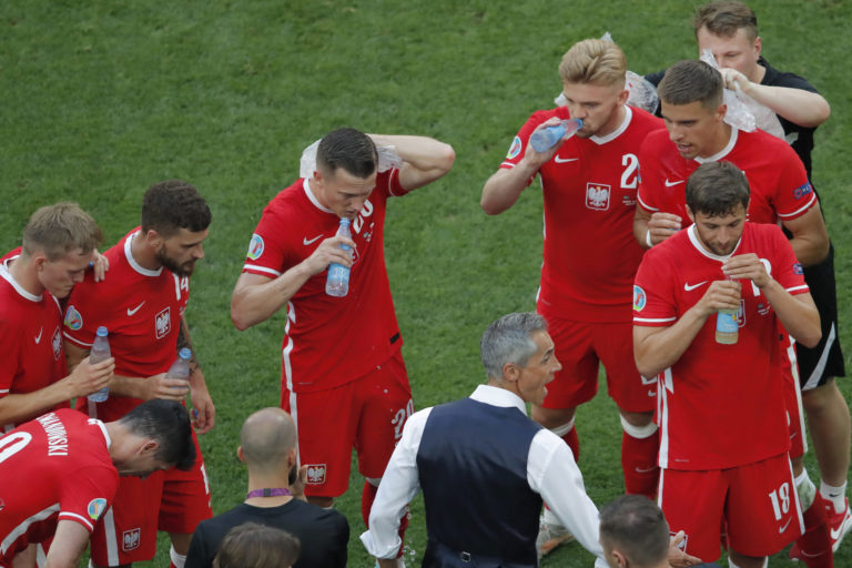 Poľský manažér Paulo Sousa hovorí so svojimi hráčmi počas zápasu E-skupiny na ME 2020. Petrohrad (Gazprom Arena), 23. jún 2021. Foto: SITA/AP
