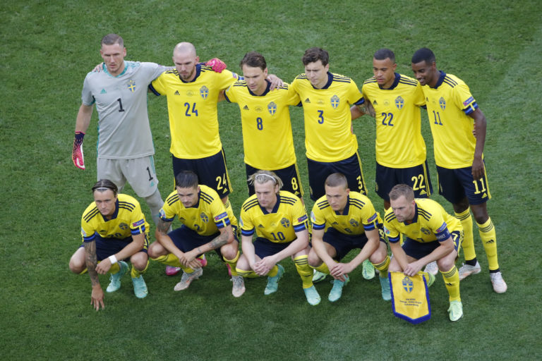 Švédski hráči sa pred zápasom s Poľskom fotia. Petrohrad (Gazprom Arena), 23. jún 2021. Foto: SITA/AP