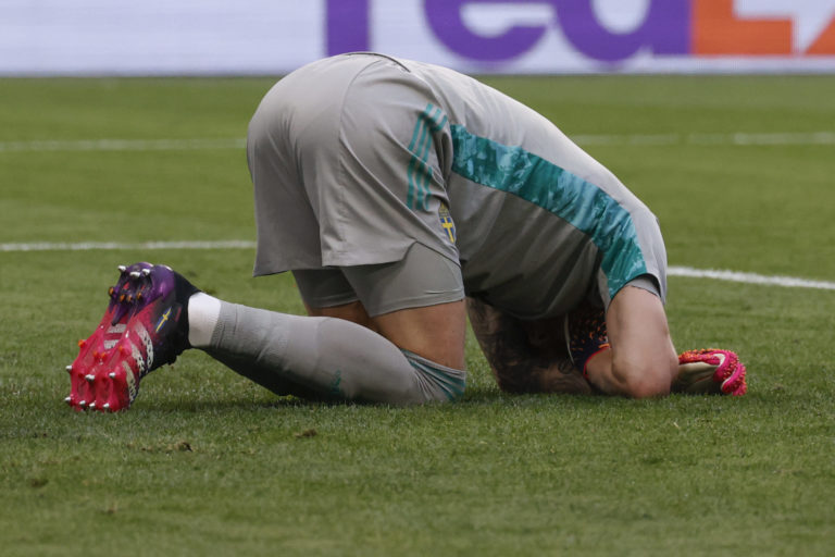 Švédsky brankár Robin Olsen (vľavo) leží na ihrisku v bolestiach. Petrohrad (Gazprom Arena), 23. jún 2021. Foto: SITA/AP