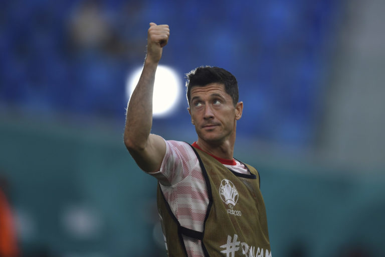 Poľský kanonier Robert Lewandowski počas rozcvičky pred zápasom E-skupiny na ME vo futbale 2020 proti Švédsku. Petrohrad (Gazprom Arena), 23. jún 2021. Foto: SITA/AP.