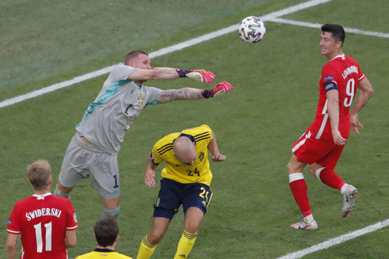 Švédsky brankár Robin Olsen odhadzuje loptu k Robertovi Lewandowskému. Petrohrad (Gazprom Arena), 23. jún 2021. Foto: SITA/AP