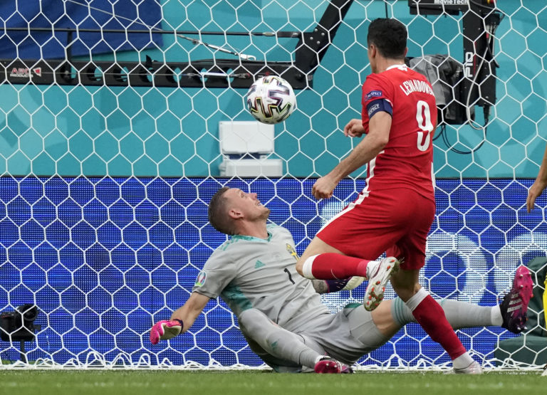Švédsky brankár Robin Olsen (vľavo) a Poliak Robert Lewandowski, ktorý premeškal šancu skórovať počas zápasu B-skupiny medzi Švédskom a Poľskom na ME 2020. Petrohrad (Gazprom Arena), 23. jún 2021. Foto: SITA/AP