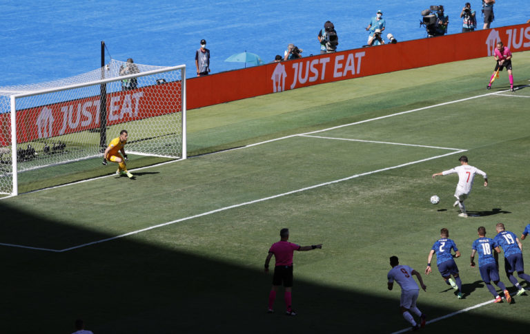 Španiel Alvaro Morata strieľa pokutový kop počas zápasu Španielska proti Slovensku na ME 2020. Sevilla (La Cartuja Stadium), 23. jún 2021. Foto: SITA/AP