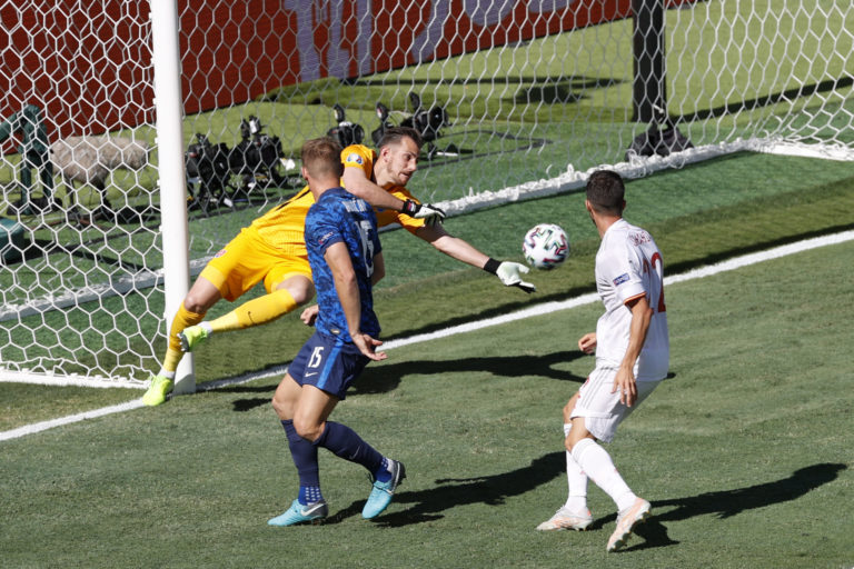 Slovenský gólman Martin Dúbravka si dáva nešťastný vlastný gól počas zápasu E-skupiny na ME vo futbale 2020 proti Španielsku. Sevilla (La Cartuja Stadium), 23. jún 2021. Foto: David Ramos, Pool photo via AP.