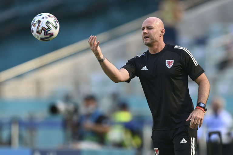 Tréner Walesu Robert Page hádže loptu počas zápasu A-skupiny na ME vo futbale 2020 proti Švajčiarsku. Baku, 12. jún 2021. Foto: SITA/AP