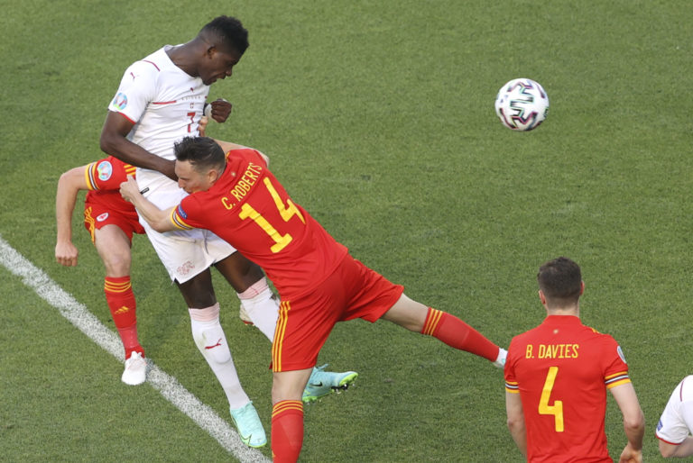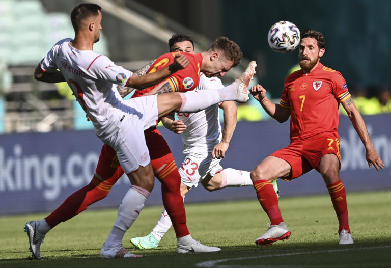 Joe Rodon z Walesu sa snaží odhlavičkovať loptu pred Harisom Seferovićom zo Švajčiarska (vľavo) počas zápasu A-skupiny na ME vo futbale 2020. Baku, 12. jún 2021. Foto: SITA/AP