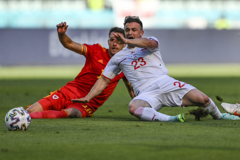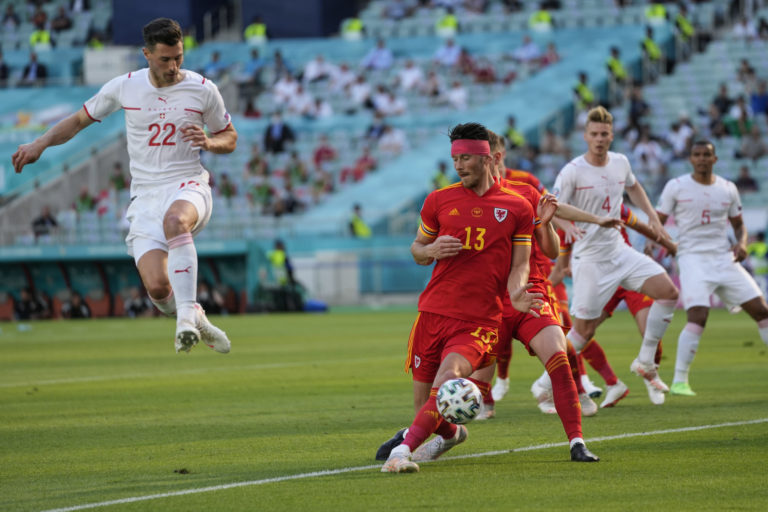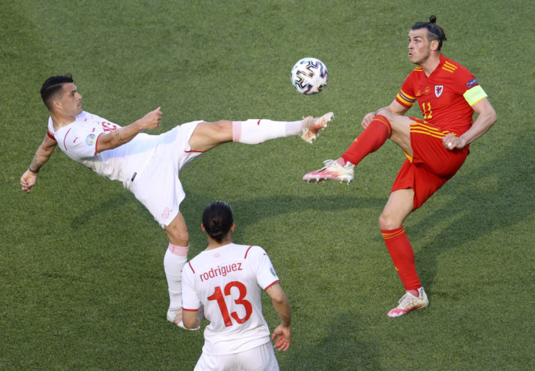 Gareth Bale z Walesu (vľavo) a Manuel Akanji zo Švajčiarska v súboji o loptu počas zápasu A-skupiny na ME vo futbale 2020. Baku, 12. jún 2021. Foto: SITA/AP