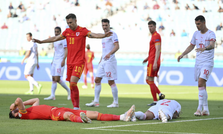 Aaron Ramsey z Walesu (vľavo hore) gestikuluje nad svojím ležiacim spoluhráčom Kiefferom Mooreom a Kevinom Mbabuom zo Švajčiarska počas zápasu A-skupiny na ME vo futbale 2020. Baku, 12. jún 2021. Foto: SITA/AP