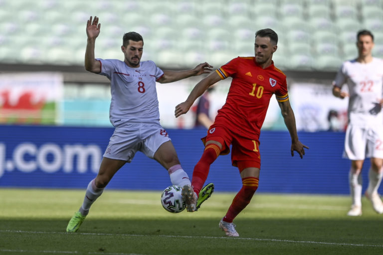 Remo Freuler zo Švajčiarska (vľavo) a Aaron Ramsey z Walesu bojujú o loptu počas zápasu A-skupiny na ME vo futbale 2020. Baku, 12. jún 2021. Foto: SITA/AP