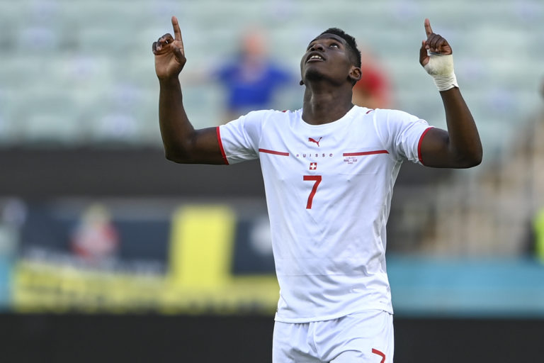Švajčiar Breel Embolo oslavuje gól v sieti Švajčiarska počas zápasu A-skupiny na ME vo futbale 2020. Baku, 12. jún 2021. Foto: SITA/AP