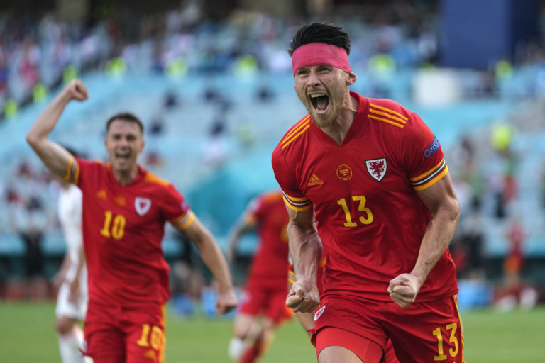 Walesan Kieffer Moore oslavuje gól v sieti Švajčiarska počas zápasu A-skupiny na ME vo futbale 2020. Baku, 12. jún 2021. Foto: SITA/AP