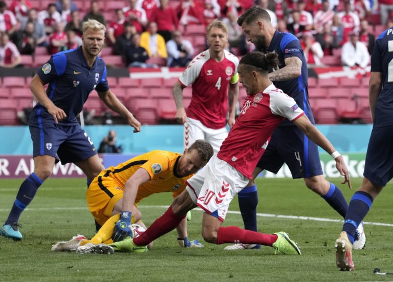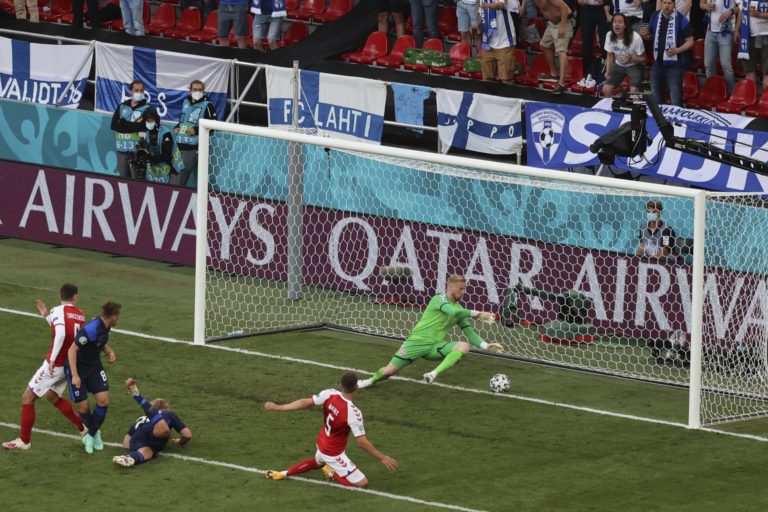 Fín Joel Pohjanpalo (v strede) prekonáva brankára Dánska počas zápasu B-skupiny na ME vo futbale 2020. Kodaň, 12. jún 2021. Foto: SITA/AP
