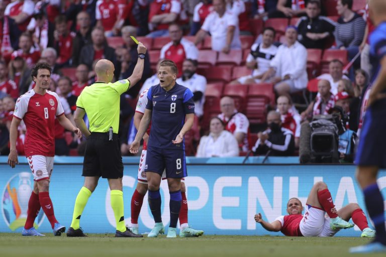 Fín Robin Lod inkasuje žltú kartu počas zápasu B-skupiny na ME vo futbale 2020. Kodaň, 12. jún 2021. Foto: SITA/AP