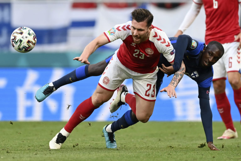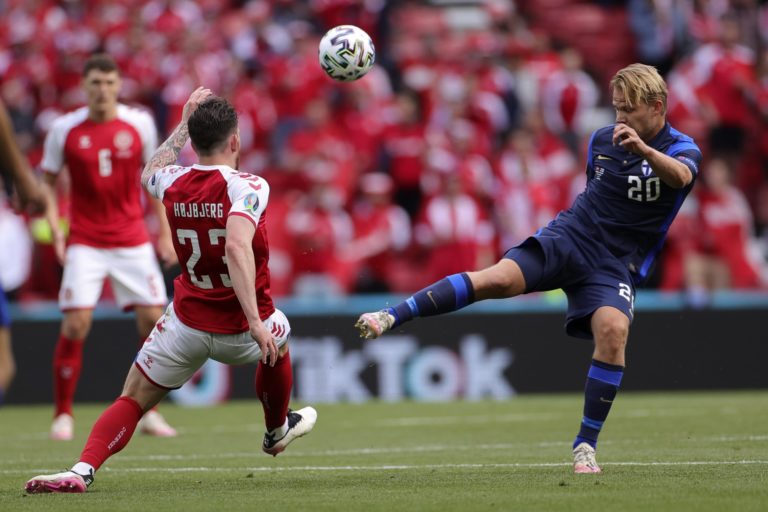 Dán Pierre-Emile Hojbjerg (vľavo) a Fín Joel Pohjanpalo počas zápasu B-skupiny na ME vo futbale 2020. Kodaň, 12. jún 2021. Foto: SITA/AP