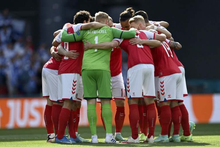 Hráči Dánska pred zápasom s Fínskom na ME vo futbale 2020. Kodaň, 12. jún 2021. Foto: SITA/AP