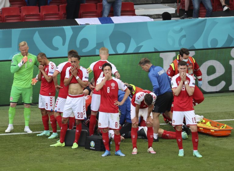 Zápas B-skupiny medzi Dánskom a Fínskom prerušil kolaps Dána Christiana Eriksena, ktorého oživovali priamo na ihrisku. Kodaň, 12. jún 2021. Foto: SITA/AP
