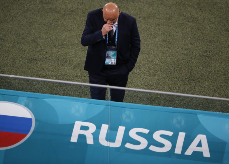 Ruský tréner Stanislav Čerčesov počas zápasu B-skupiny na ME vo futbale 2020. Petrohrad, 12. jún 2021. Foto: SITA/AP