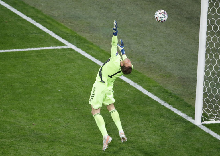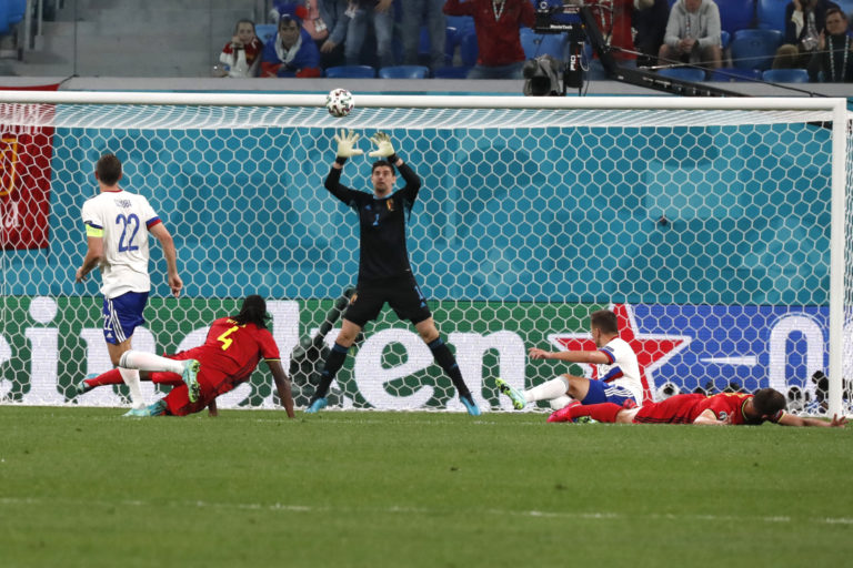 Brankár Belgicka Thibaut Courtois zneškodňuje príležitosť Ruska počas zápasu B-skupiny na ME vo futbale 2020. Petrohrad, 12. jún 2021. Foto: SITA/AP