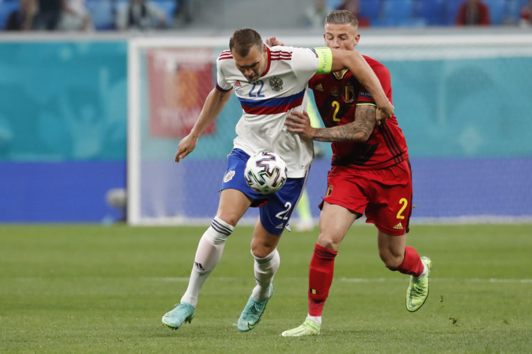Rus Artem Dzjuba (vľavo) a Belgičan Toby Alderweireld v súboji o loptu počas zápasu B-skupiny na ME vo futbale 2020. Petrohrad, 12. jún 2021. Foto: SITA/AP