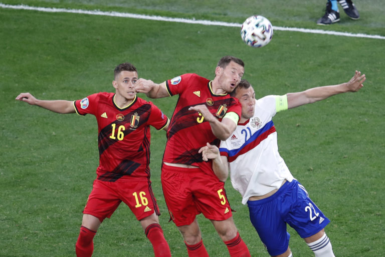 Zľava: Belgičania Thorgan Hazard, Jan Vertonghen a Rus Artem Dzjuba počas zápasu B-skupiny na ME vo futbale 2020. Petrohrad, 12. jún 2021. Foto: SITA/AP