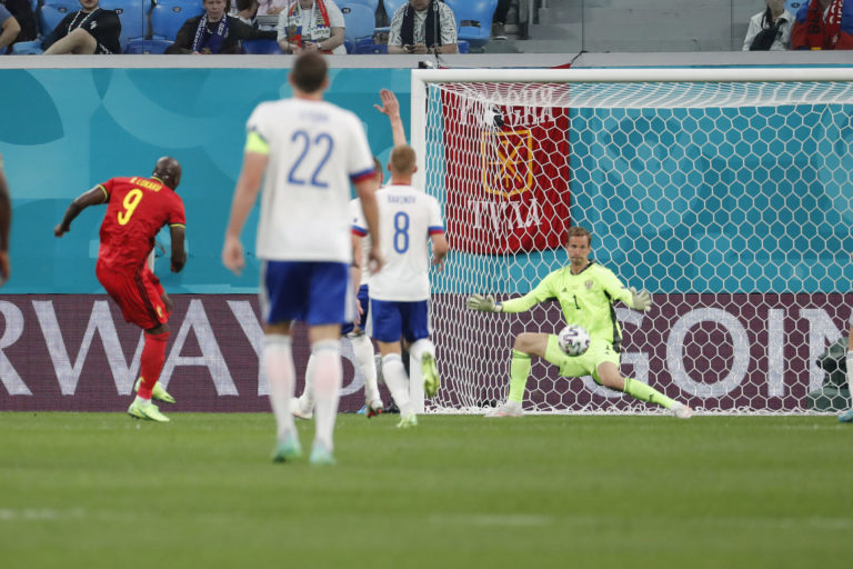Belgičan Romelu Lukaku (vľavo) strieľa gól do siete Ruska počas zápasu B-skupiny na ME vo futbale 2020. Petrohrad, 12. jún 2021. Foto: SITA/AP