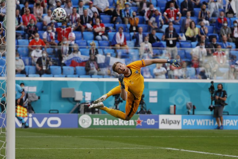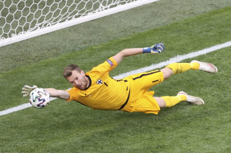 Fínsky gólman Lukas Hradecky sa snaží chytiť loptu počas zápasu B-skupiny na ME vo futbale 2020. Petrohrad, 16. jún 2021. Foto: SITA/AP