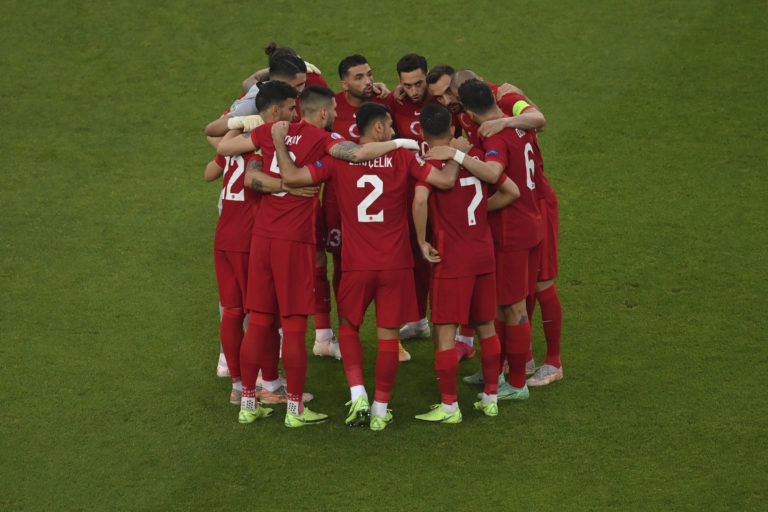 Reprezentanti Turecka pred zápasom proti Walesu na ME vo futbale 2020. Baku (Olympijský štadión), 16. jún 2021. Foto: Dan Mullan/Pool via AP.