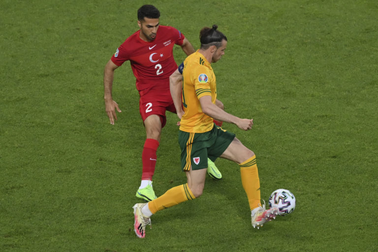 Turecký reprezentantn Zeki Celik v súboji s Walesanom' Aaronom Ramseym počas zápasu A-skupiny na ME vo futbale 2020. Baku (Olympijský štadión), 16. jún 2021. Foto: Tolga Bozoglu/Pool Photo via AP.
