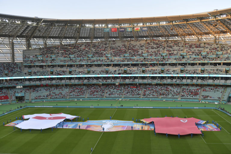 Úvodný ceremoniál zápasu medzi Tureckom a Walesom na ME vo futbale 2020. Baku (Olympijský štadión), 16. jún 2021. Foto: Dan Mullan/Pool via AP.